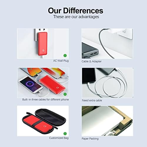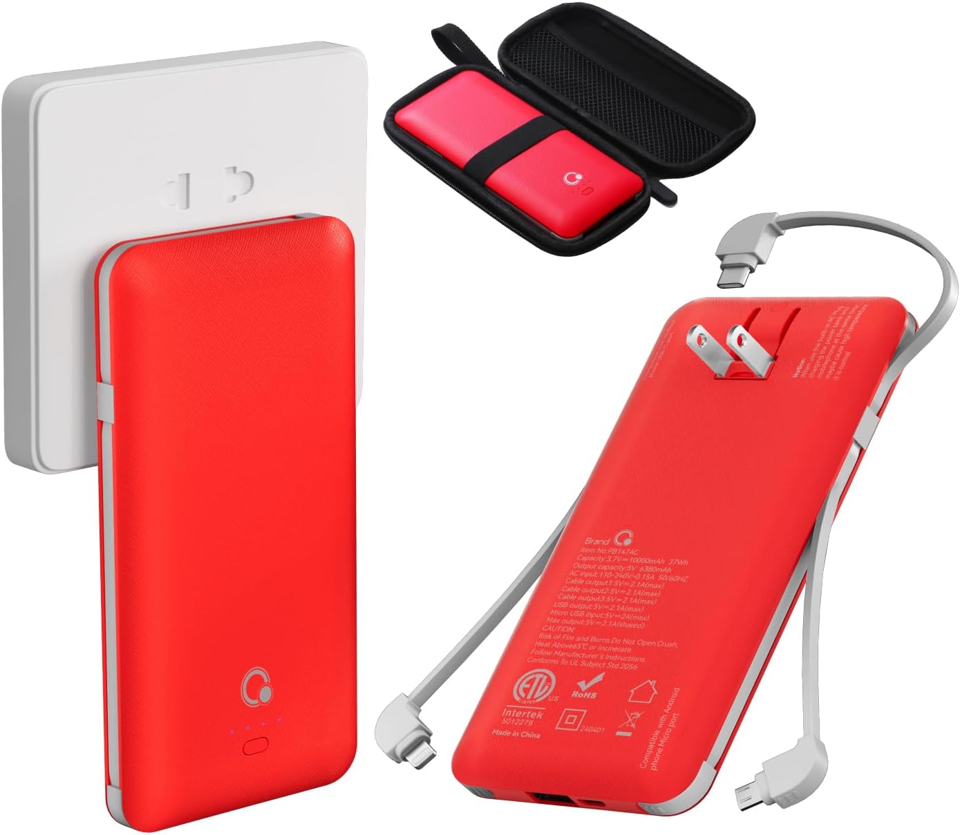 10000mAh Portable Charger, Slim USB B C Power Bank,4 Output External Battery Pack with Built-in AC Wall Plug Micro and USB C Three Cables Compatible with All mobilephone
